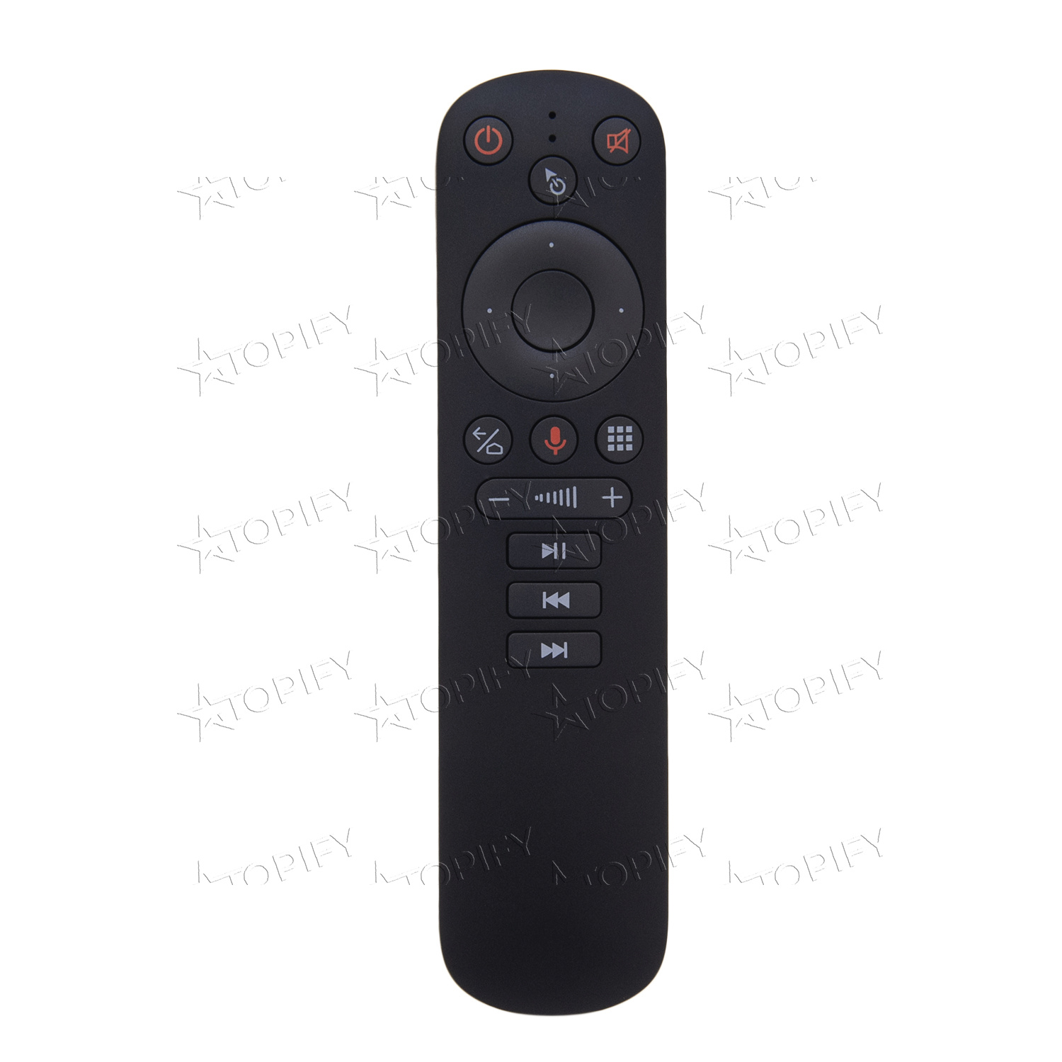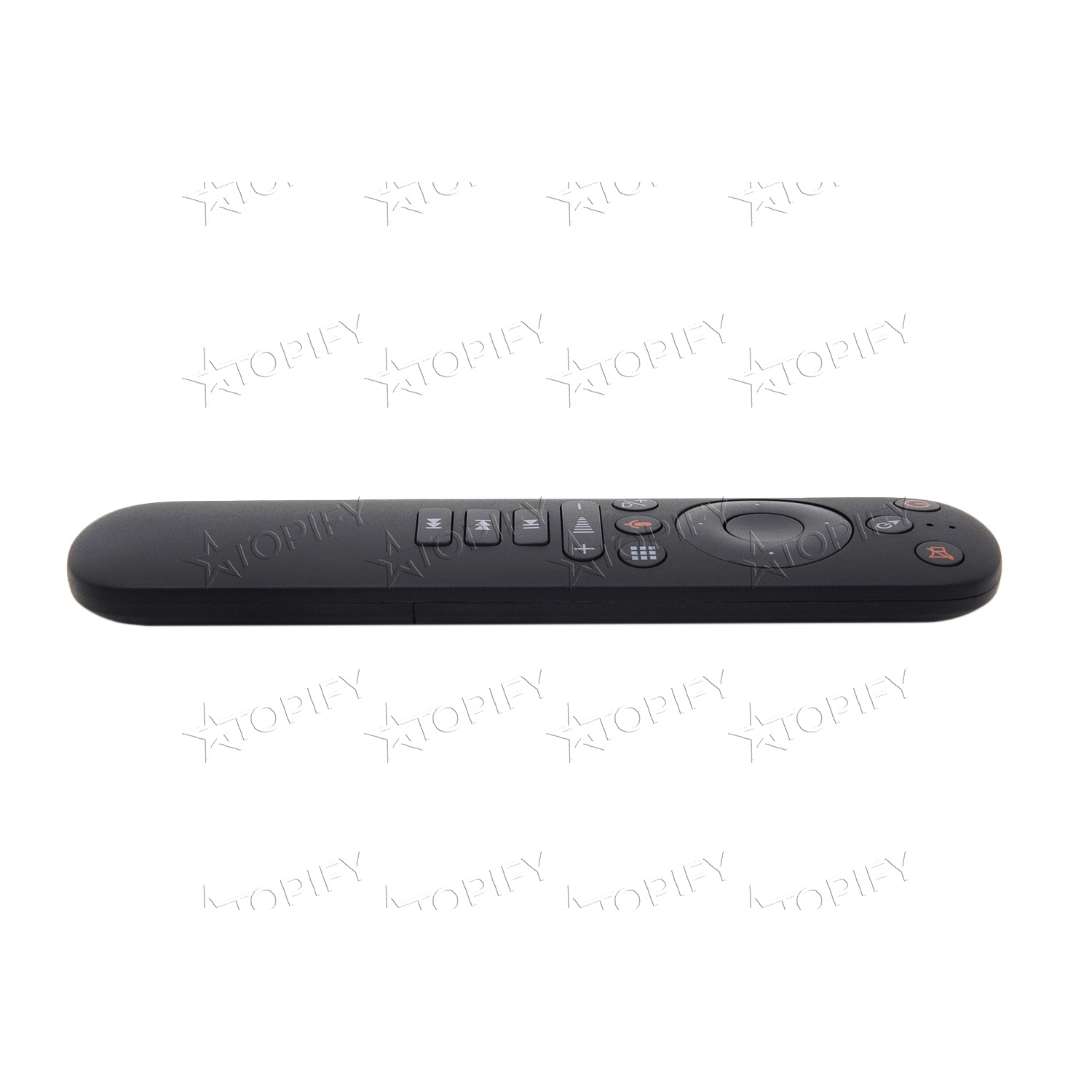 Дистанционный пульт управления с функцией аэромыши. Подходит для большинства современных гаджетов, оснащенных модулями беспроводной связи. Соединение между пультом и девайсом осуществляется на частоте 2,4 ГГц на расстоянии до 10 м. Встроенные гироскопы позволяют управлять курсором, меняя пространственное положение пульта. Предусмотрена поддержка голосового управления. Питается пульт от двух батареек формата ААА.